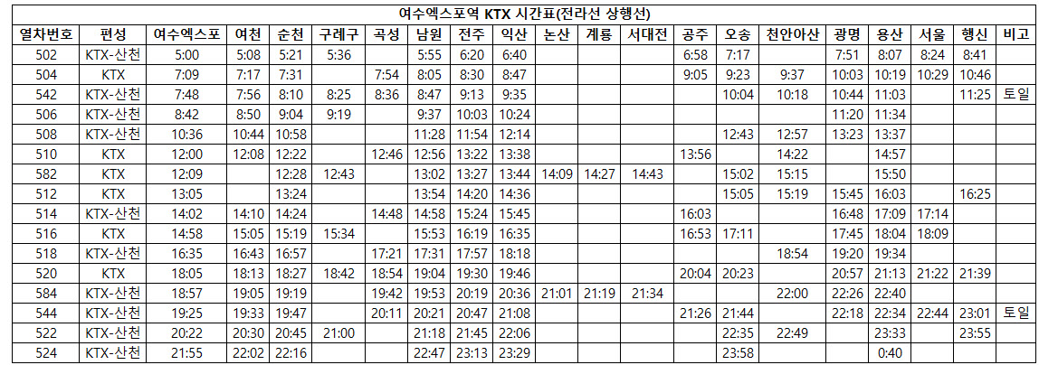 여수엑스포역 KTX 시간표(전라선 상행선) |